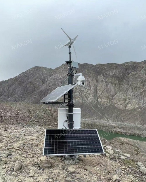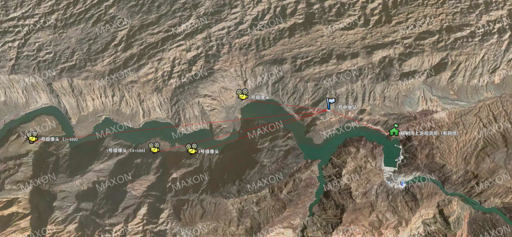 如圖1,4個(gè)監(jiān)控點(diǎn)位分布在河谷兩側(cè),中繼基站位置為原運(yùn)營商基站位置,為當(dāng)前區(qū)域內(nèi)的制點(diǎn),距離最遠(yuǎn)監(jiān)控點(diǎn),距離大概5公里,靠外的兩個(gè)點(diǎn)位夾角25°。中繼基站距離柳樹溝觀測站距離約1km左右。監(jiān)控前端采用風(fēng)光供電方案,點(diǎn)位選擇時(shí),兼顧日照條件良好。